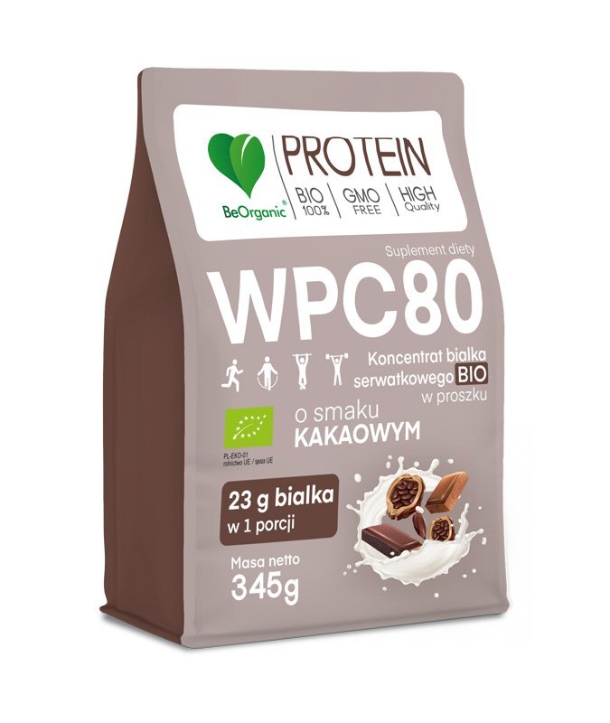 Suplement diety Aliness BeOrganic WPC80 Koncentrat białka serwatkowego BIO w proszku o smaku kakaowym do rozpuszczania w wodzie, mleku lub napojach roślinnych to produkt otrzymywany z mleka pochodzącego z ekologicznych gospodarstw.