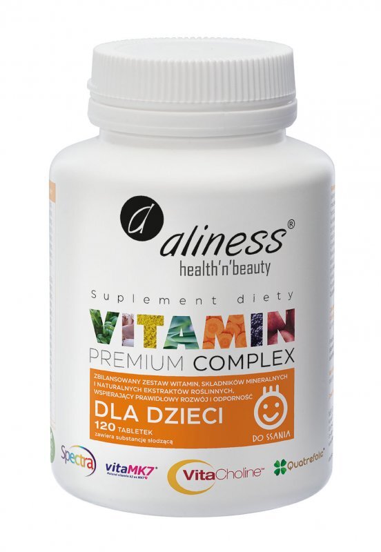 Suplement diety Aliness Premium Vitamin Complex dla dzieci to preparat w postaci tabletek do ssania opracowany w oparciu o najwyższej jakości składniki pomagające uzupełnić dzienne zapotrzebowanie organizmu dziecka w składniki mineralne i witaminy wspierające funkcjonowanie układu odpornościowego, nerwowego, prawidłowe widzenie i utrzymanie zdrowych kości.
