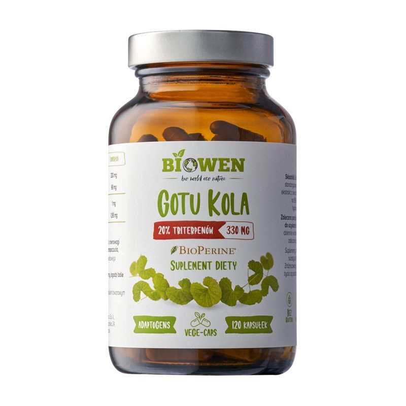 Suplement diety Gotu Kola (Centella asiatica - wąkrotka azjatycka) to preparat standaryzowany na 20% triterpenów, zawierający dodatkowo standaryzowany na 95% piperyny wyciąg z pieprzu czarnego, który wzmacnia działanie adaptogenu.