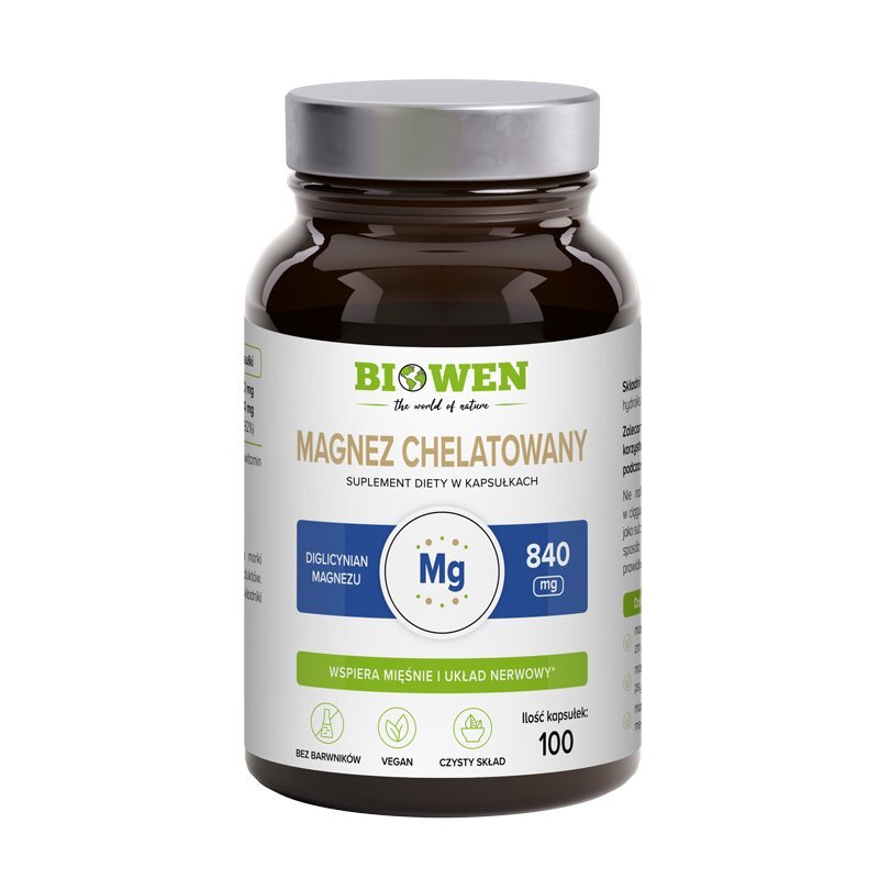 Suplement diety Magnez chelatowany (diglicynian magnezu) to preparat zawierający chelatowaną formę magnezu, dzięki czemu magnez może się lepiej wchłaniać w jelitach. Suplement dostarcza duża dawkę magnezu bez obciążania układu trawiennego, dzięki czemu może być stosowany przez osoby z wrażliwym przewodem pokarmowym.