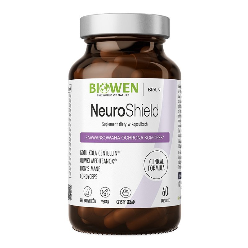 Suplement diety NeuroShield to preparat w postaci kapsułek zawierający starannie dobrane grzyby witalne, adaptogeny i antyoksydanty stworzony z myślą o wsparciu pracy mózgu.