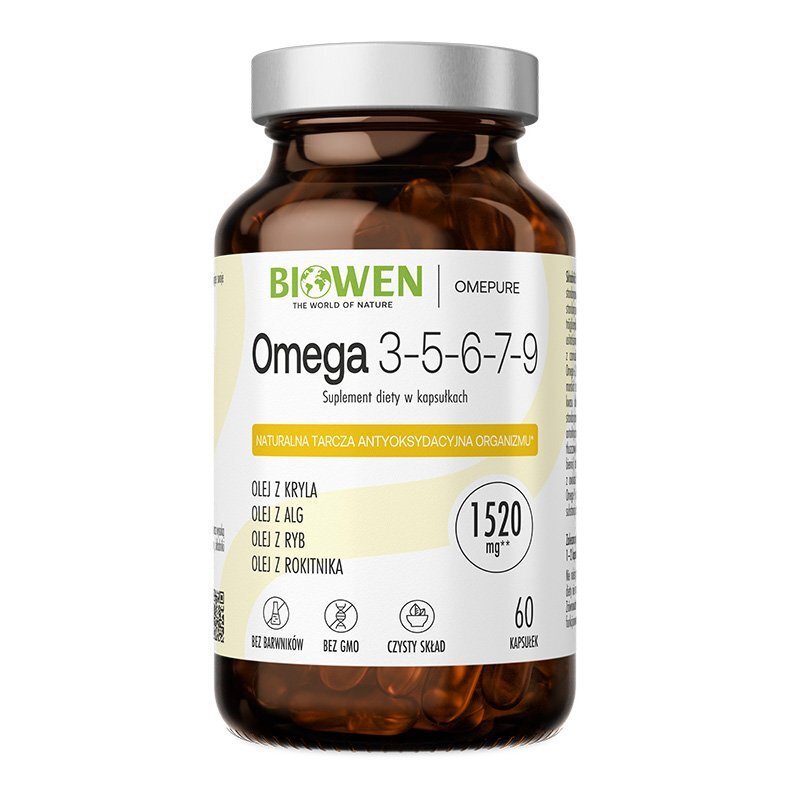 Suplement diety Omega 3-5-6-7-9 to preparat zawierający 5 rodzajów kwasów omega pochodzenia morskiego i roślinnego w optymalnych proporcjach.