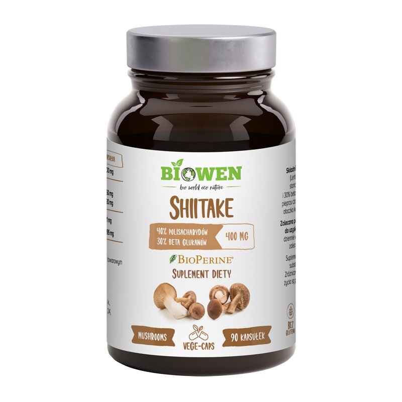 Suplement diety Shiitake 400mg to preparat standaryzowany na 40% polisacharydów, w tym 30% beta-glukanów zawierający dodatkowo standaryzowany na 95% piperyny wyciąg z pieprzu czarnego, który wzmacnia działanie grzybów.