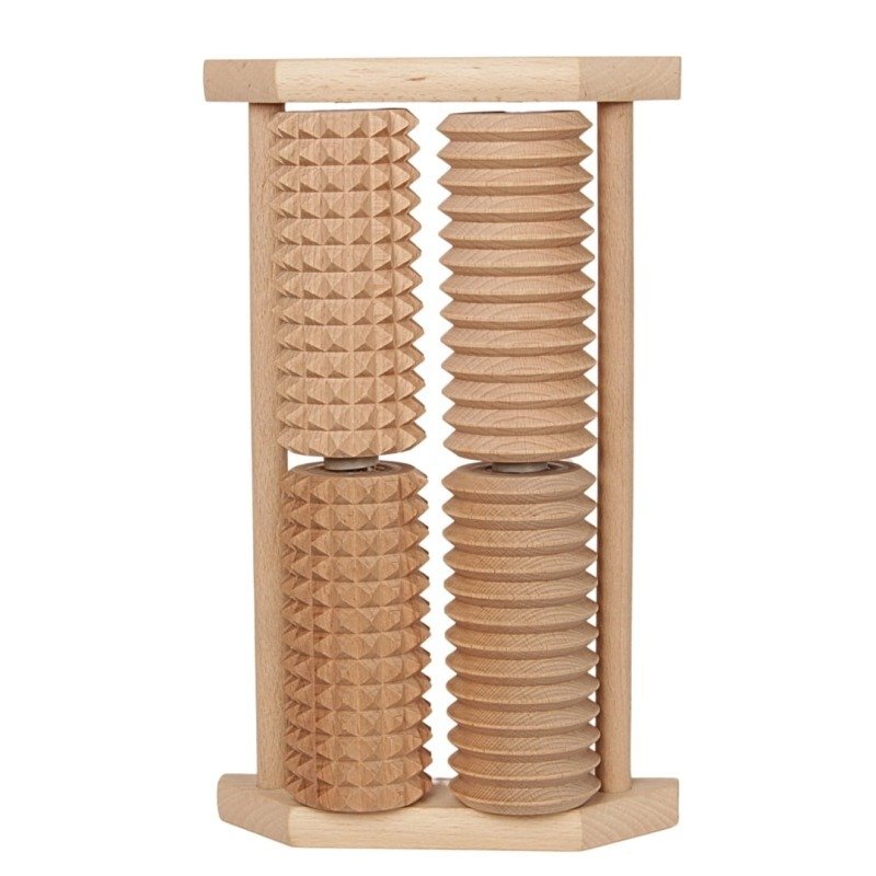 Podwójny masażer drewniany łączy dwa typy wałków - z kolcami i krążkami zapewniając kompleksowy masaż. Drewniane kolce stymulują przeróżne punkty refleksologiczne i mogą poprawić krążenie. Krążki masujące delikatnie rozluźniają mięśnie i przynoszą uczucie lekkości. Elegancki stojak i Prosta konstrukcja połączona z naturalnymi materiałami sprawiają, że masaż staje się codziennym wyczekiwanym rytuałem relaks, który można wykonać samodzielnie niezależnie od miejsca - w pracy, domu, czy po treningu.
