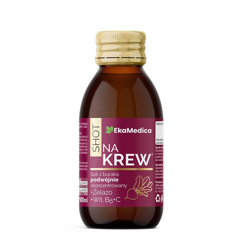 Suplement diety Shot na krew w postaci płynu do bezpośredniego spożycia zawierający podwójnie skoncentrowany sok z buraka, ekstrakt z buraka, żelazo i witaminy.