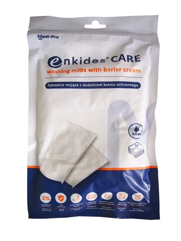 Rękawice myjące z dodatkiem kremu barierowego, który w miejscu zastosowania pozostawia warstwę ochronną przed czynnikami zewnętrznymi lub efektami nietrzymania moczu.