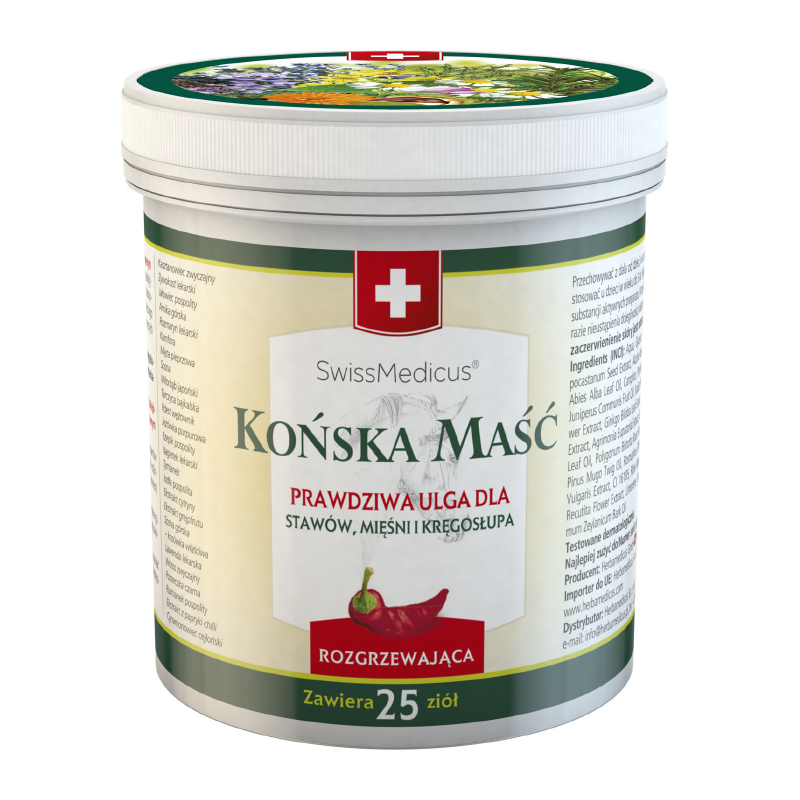 Końska maść rozgrzewająca jest najlepszym rozwiązaniem do kojących masaży mięśni i stawów, wyprodukowanym z 25 rodzajów ekstraktów ziołowych i roślinnych bez użycia toksycznych chemikaliów, według tradycyjnej oraz sprawdzonej przez pokolenia receptury. Zrównoważona zawartość tych substancji gwarantuje szerokie i bardzo skuteczne działanie w pielęgnacji mięśni.