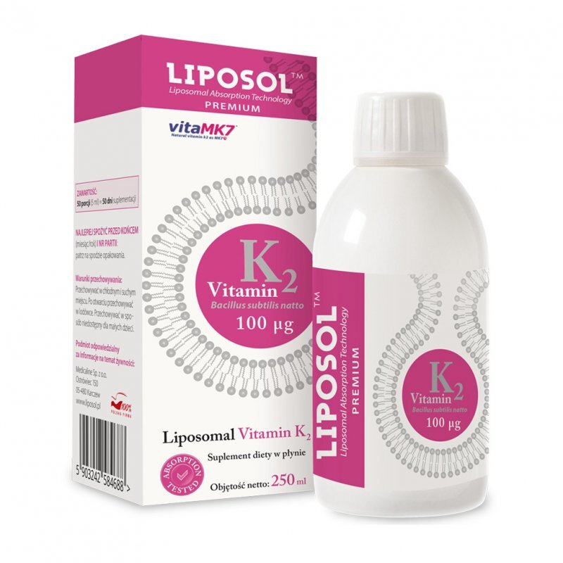 Suplement diety Liposol™ Liposomalna Witamina K2 (Vita MK7) to produkt w postaci płynu do rozpuszczania w wodzie lub soku bez dodatku cukru i glutenu zawierający zamkniętą w liposomach naturalną witaminę K z fermentacji bakterii Bacillus Subtillis Natto.