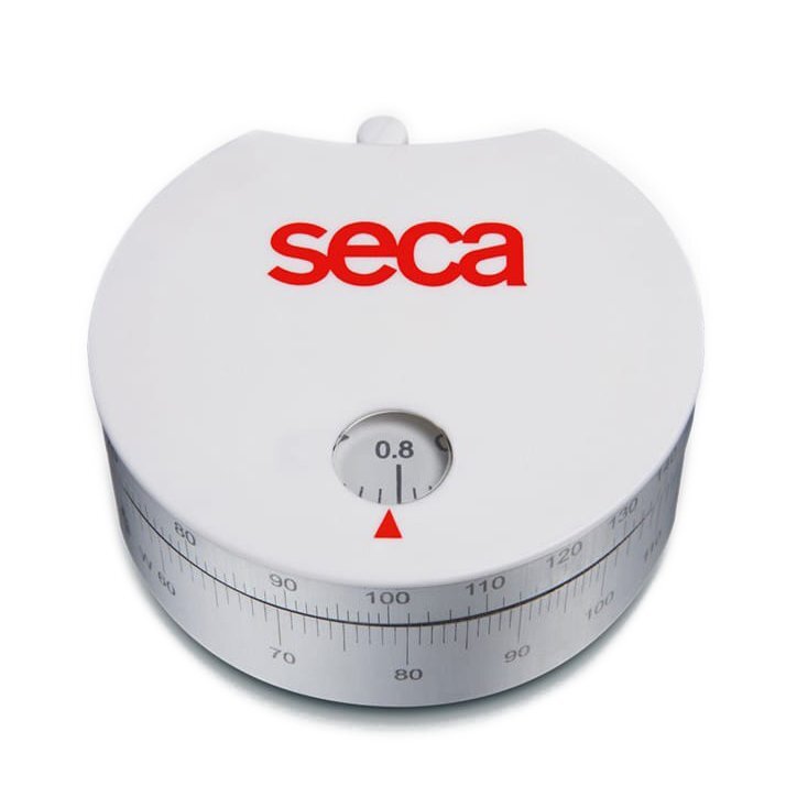 Praktyczna miarka do obwodów SECA z wskaźnikiem talia/biodra (WHR waist yo hip ratio) z automatycznym systemem zwijania i maksymalnym zakresem pomiaru do 205 cm.
