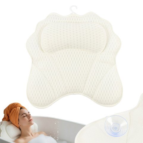 Poduszka relaksacyjna do kąpieli o ergonomicznym kształcie, która wspiera odcinek szyjny i górną część pleców podczas kąpieli w wannie.