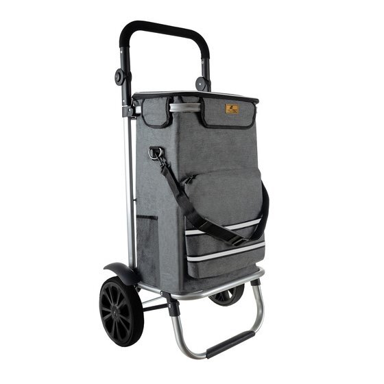 Składany, wielofunkcyjny wózek na zakupy z wodoodporną torbą, którą można zarówno przewozić na wózku, jak i nosić na pasku.