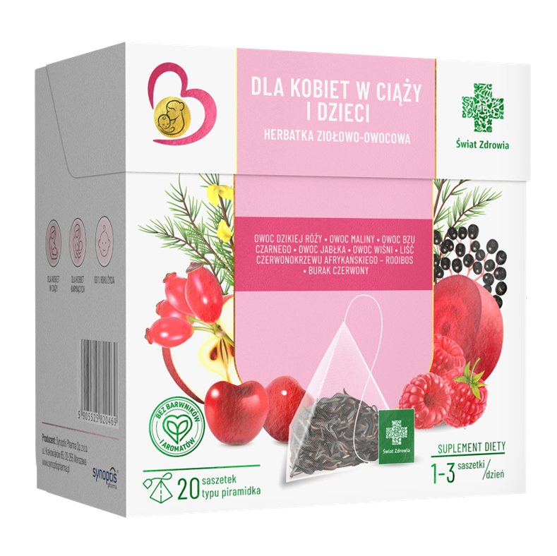 Herbatka ziołowo-owocowa Dla kobiet w ciąży i dzieci ze 100% surowców pochodzenia naturalnego zamkniętych w saszetkach typu piramidki bez barwników i aromatów.