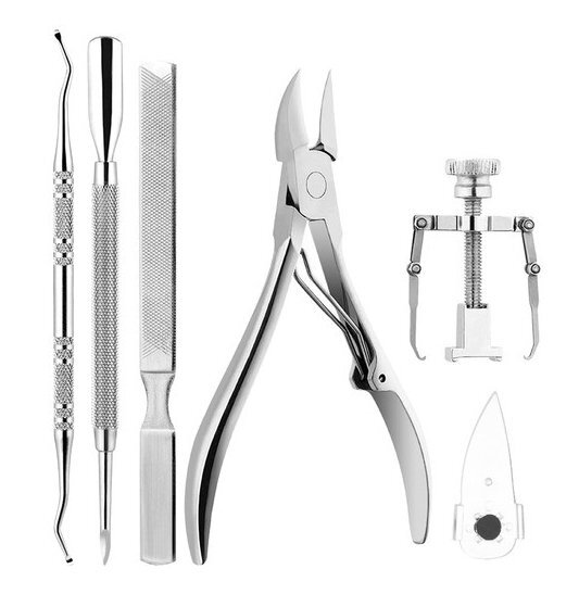 Wykonany z wysokiej jakości stali nierdzewnej zestaw do wrastających paznokci zawierający 6 profesjonalnych narzędzi potrzebnych do przeprowadzenia zabiegu podologicznego.